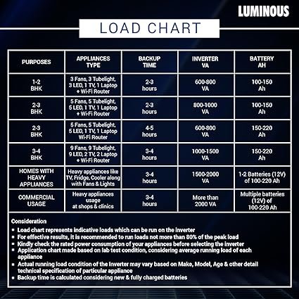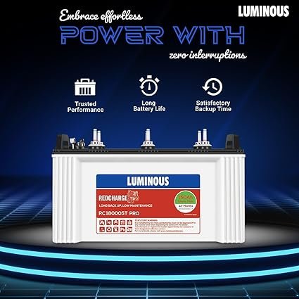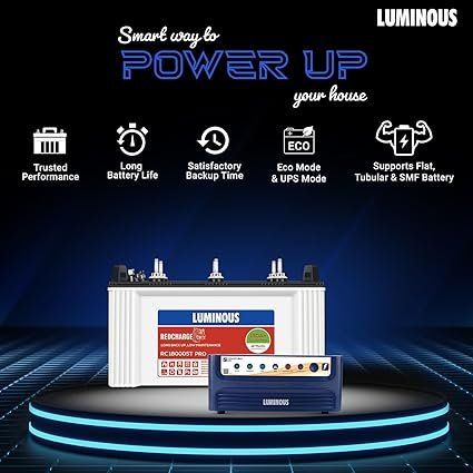 - Warranty: 2 years on inverter & 3 years on inverter battery (18 Months(flat)+18 (Pro-rata)); Package Inclusion: Luminous Power Sine 800 Pure Sine Wave Inverter, RC18000ST 150 Ah Short Tubular Battery, Instruction Manual, Warranty Card