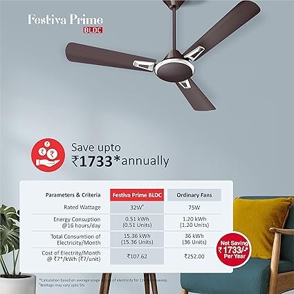 Prime Bldc Motor Ceiling Fan|5 Stars Cf With Rf Remote, 100% Copper, Upto 59% Energy Saving|Eco Active Technology, 2 Year Warranty